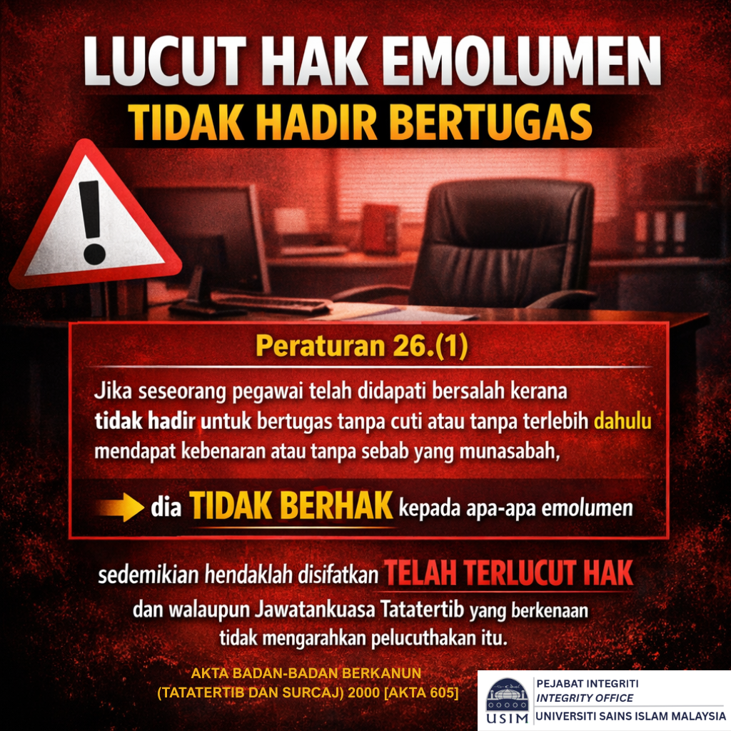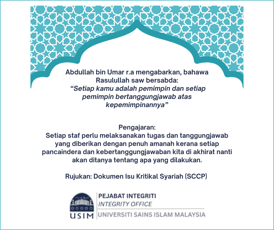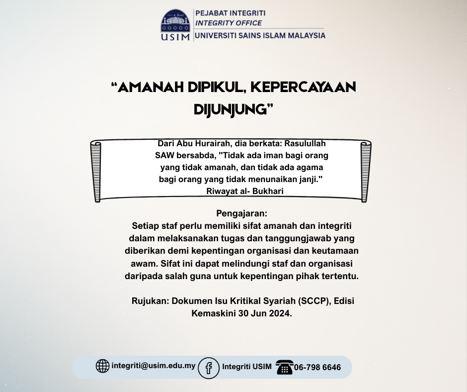 NILAI, 8 November 2022 – Bahagian Pematuhan Syariah, Integriti, Pengurusan Risiko dan Keselamatan dan Kesihatan Pekerjaan (SCIROSH), Universiti Sains Islam Malaysia (USIM) telah menganjurkan program Bicara Integriti bertajuk Tuntutan Palsu Adalah Satu Jenayah Rasuah pada 8 November 2022. Program ini […]